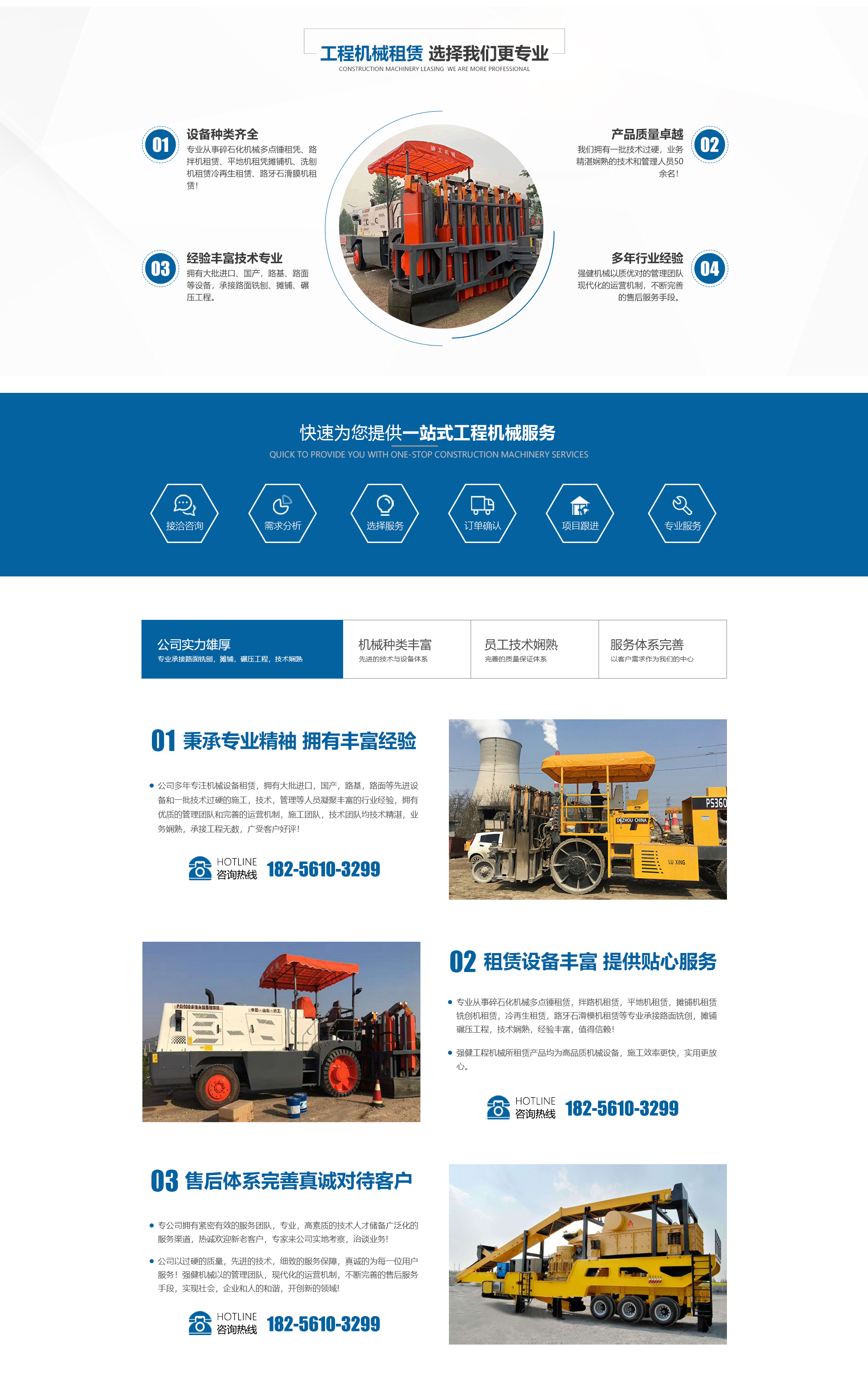 安徽強建工程機械有限公司是一家專業從事碎石化機械多點錘租賃、路拌機租賃、平地機租賃攤鋪機、洗刨機租賃、冷再生租賃、路牙石滑膜機租賃的企業。擁有大批進口、國產,路基、路面等設備,承接路面銑刨、攤鋪、碾壓工程,還有一批技術過硬、素質的施工、技術、管理等人員!技術和管理人員50余名,全部為大專以上學歷,技術精湛,業務嫻熟。強健機械以的管理團隊,現代化的運營機制,不斷完善的售后服務手段,實現社會,企業和人的和諧,開創新的領域!強健公司熱誠歡迎新老客戶、專家來公司實地考察,洽談業務!